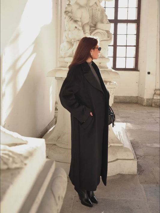 Black Wool Double-Breasted Coat with Belt