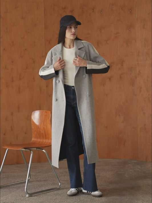 Gray Double-Breasted Long Coat with trim ribbon