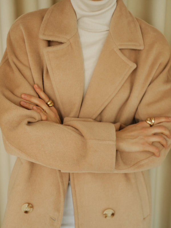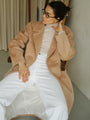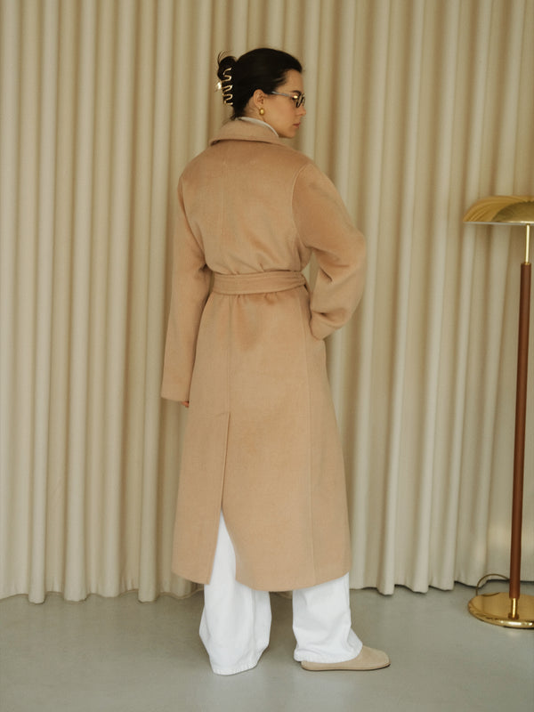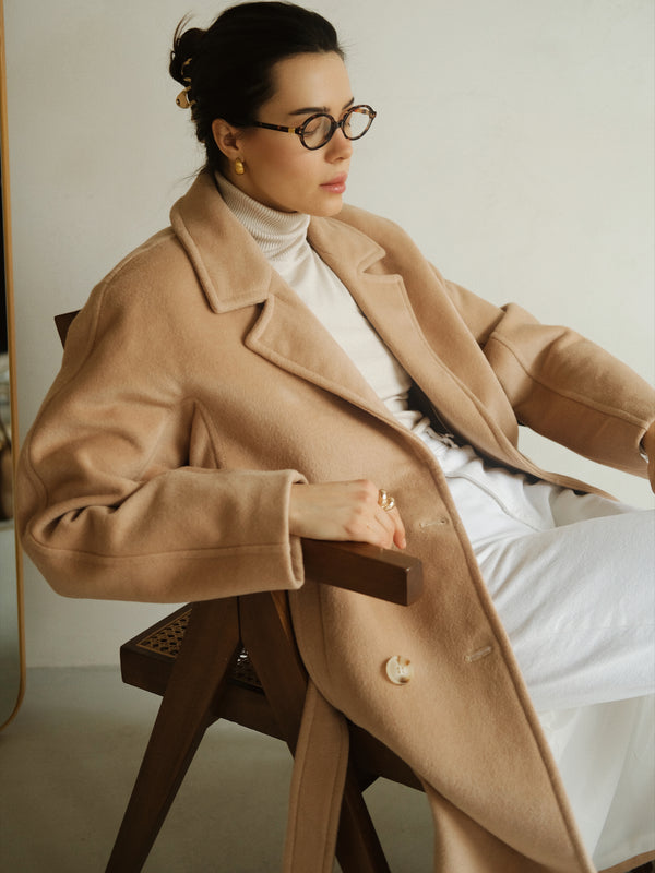 Buy beige wool coat with Belt online today and experience the unparalleled quality of CHÉLIE.