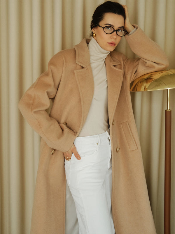 Chelie's beige long wool coat with belt, an essential for women seeking elegance. Crafted from a premium blend of 90% wool and 10% Polyamide.The topcoat features a flared silhouette, a double - breasted collar, welt pockets, combining modern and functionality.