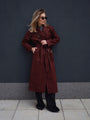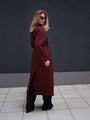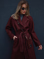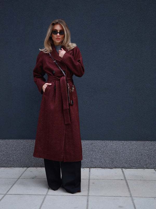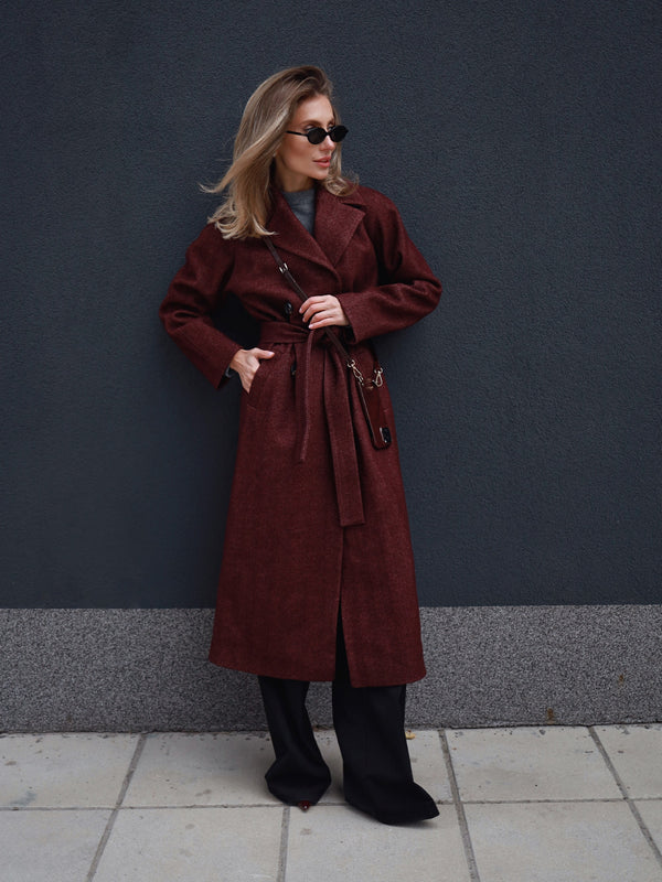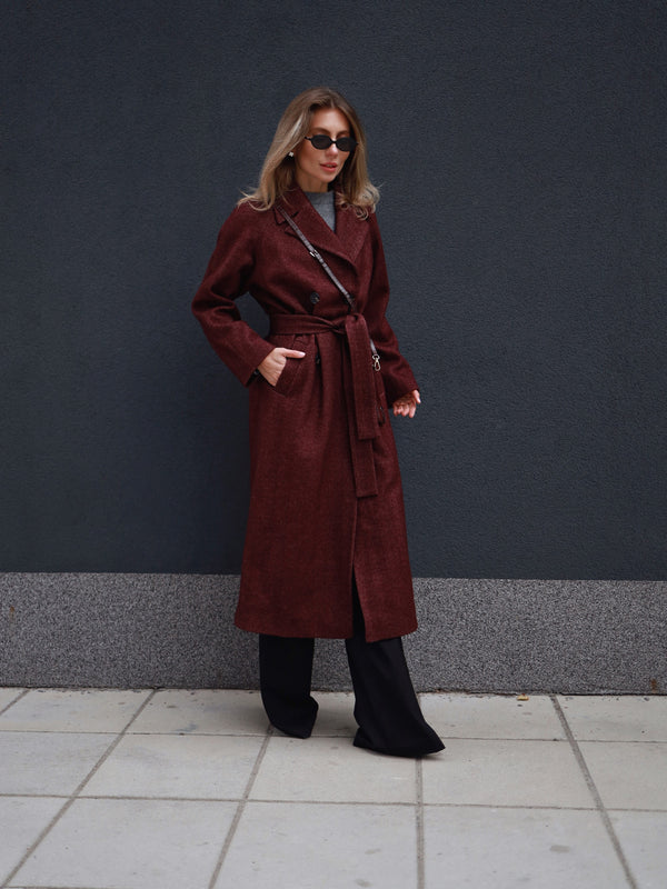 Chelie's raglan coat for women, crafted from a luxurious blend of Italian wool. Designed with a burgundy herringbone pattern, this wool raglan coat features an elegant tailored fit with a belt to accentuate the waist. Its sleeves ensure a relaxed yet structured silhouette, offering effortless sophistication.