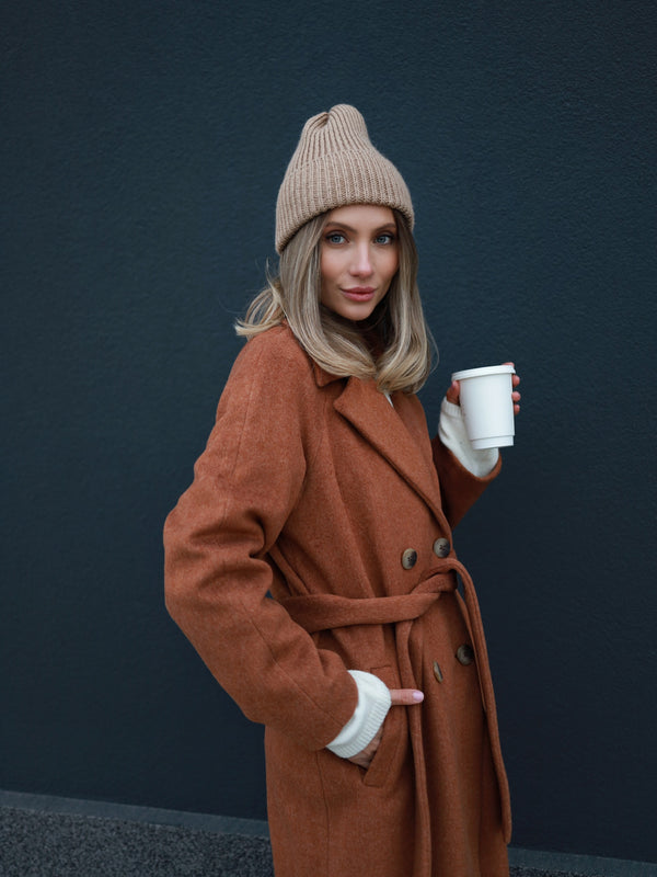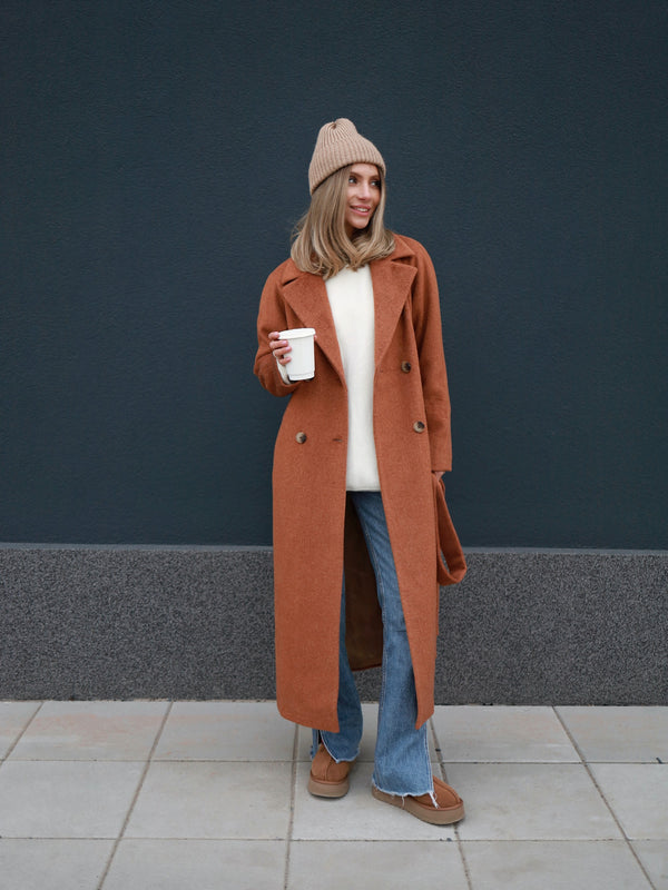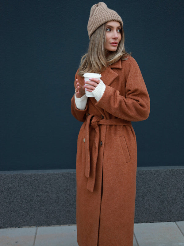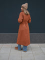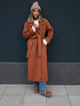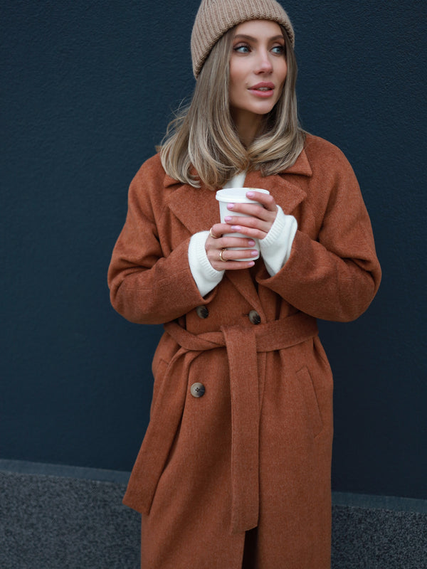 Warm Chelie's pile coat for women, handcrafted from a high-quality wool blend. Designed for practicality, this soft pile coat offers a slightly flared silhouette that flatters the figure, while the matching belt accentuates the waist. The overcoat is detailed with refined lapels, discreet slit pockets, and a button closure for a perfect look.