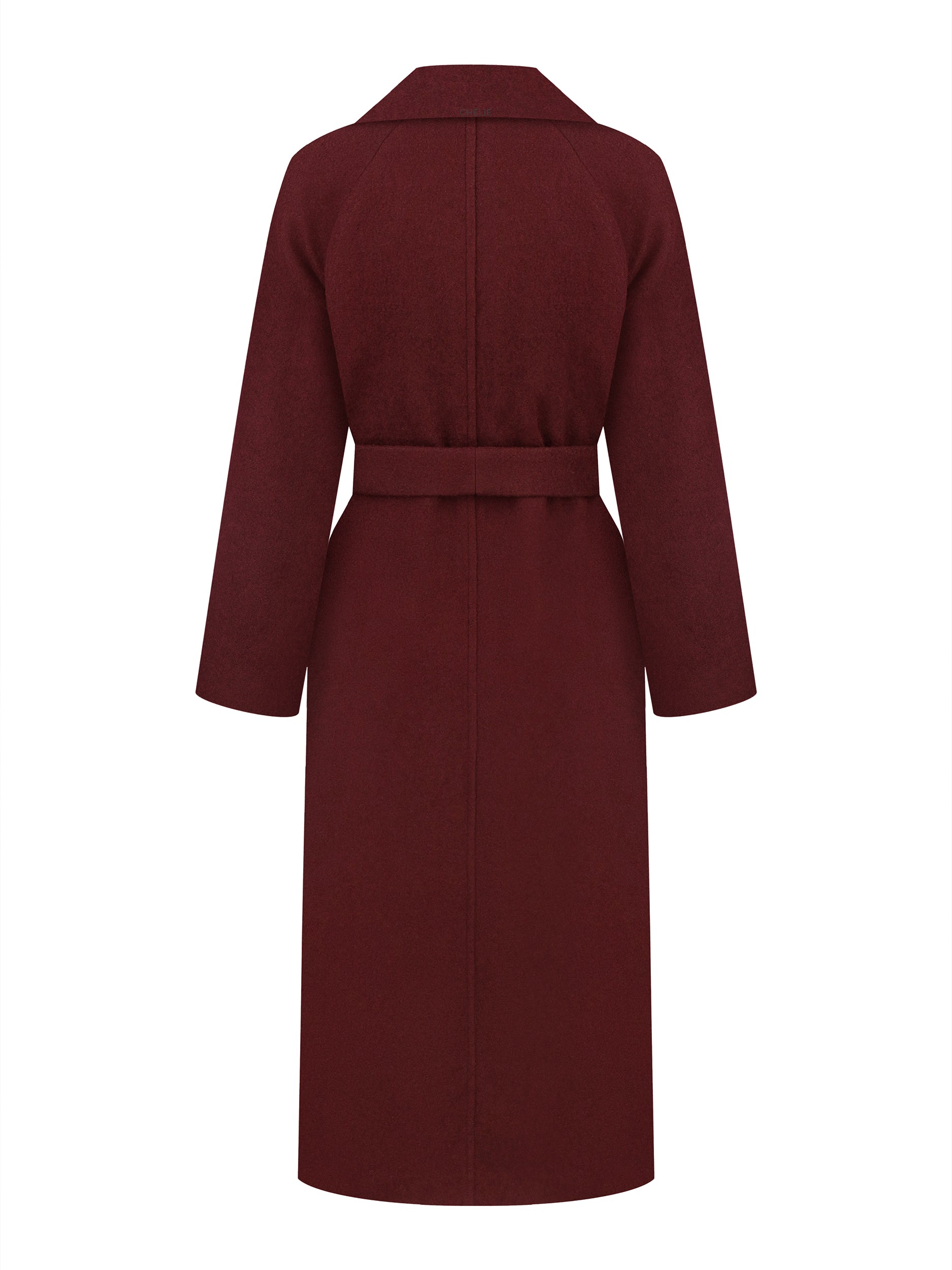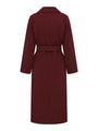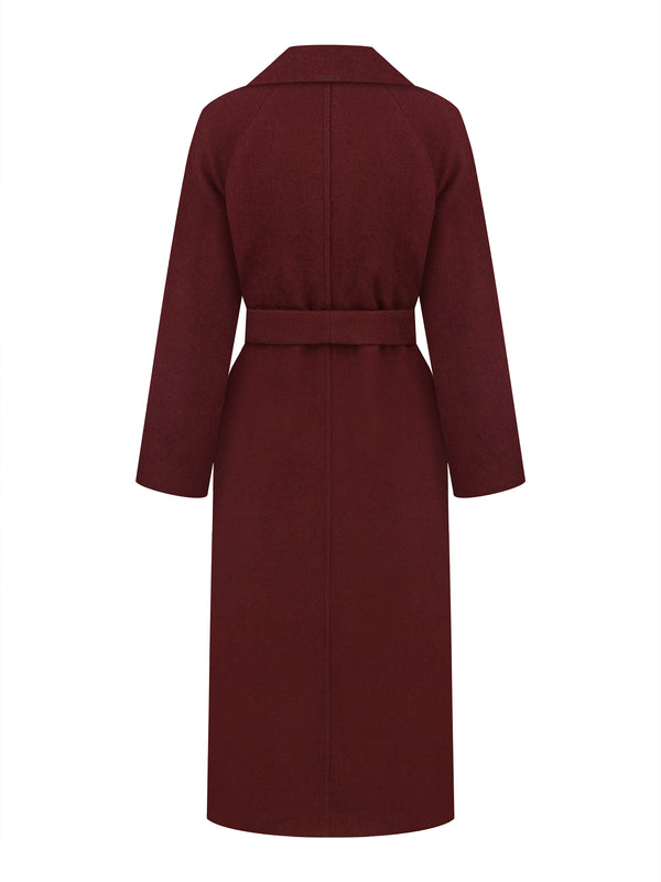 Elevate your wardrobe with our women’s long burgundy coat, a hand-stitched masterpiece crafted from high-quality fabric with wool. This stylish wool burgundy coat features lapels, slit pockets, and long sleeves, enhanced with an external trim tape for a refined look. The matching belt allows you to accentuate your waist, making this topcoat both elegant and flattering.