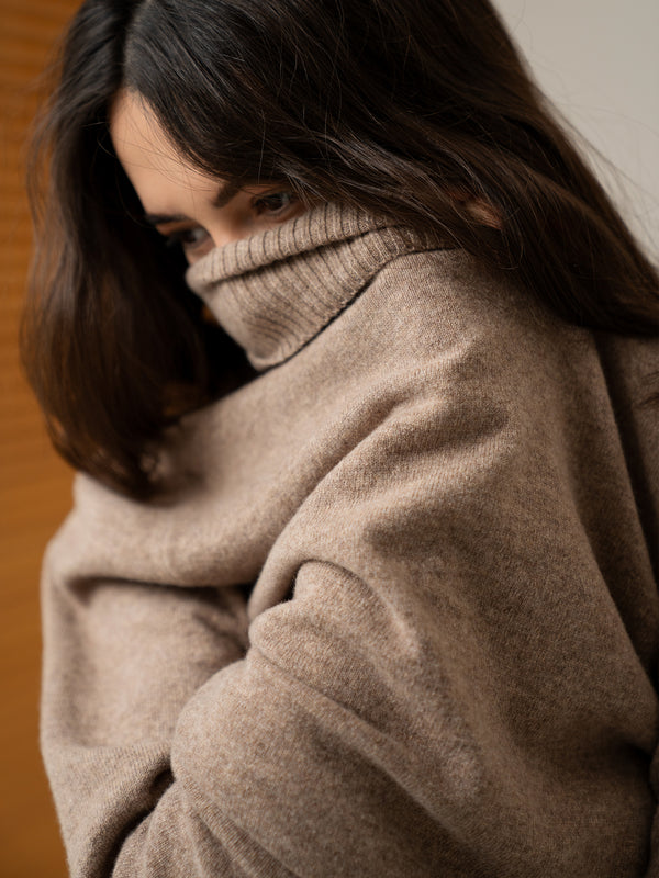 The CHELIE beige turtleneck embodies minimalism that works for you. Knitted from premium Italian yarn—90% ultrafine merino wool blended with 10% cashmere—it offers natural warmth, breathability, and softness while keeping its shape over time.