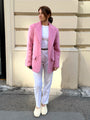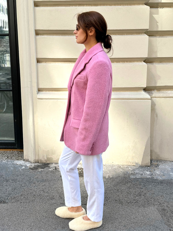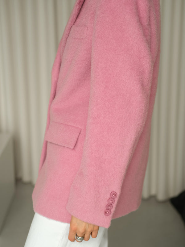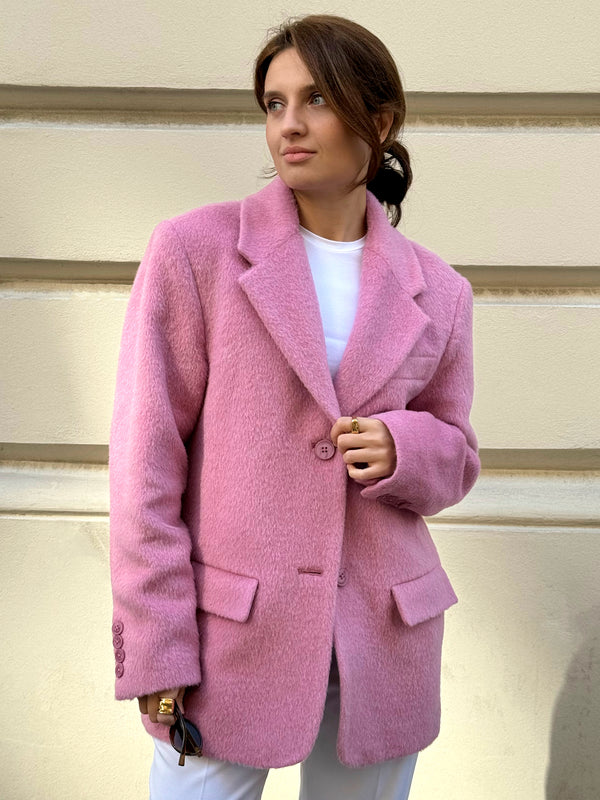 Created with a masculine-inspired silhouette, this ladies' pink wool jacket offers versatility view. Its oversized cut allows for easy layering over sweaters or hoodies, making it an essential seasonal piece.